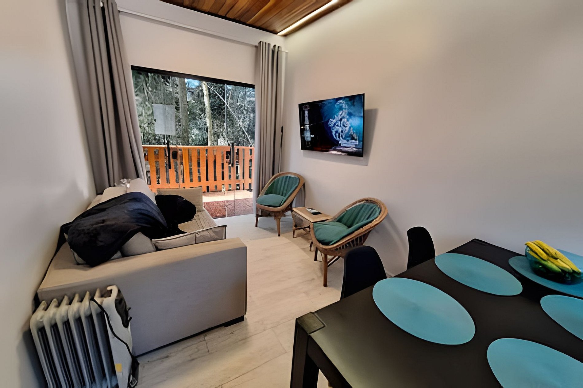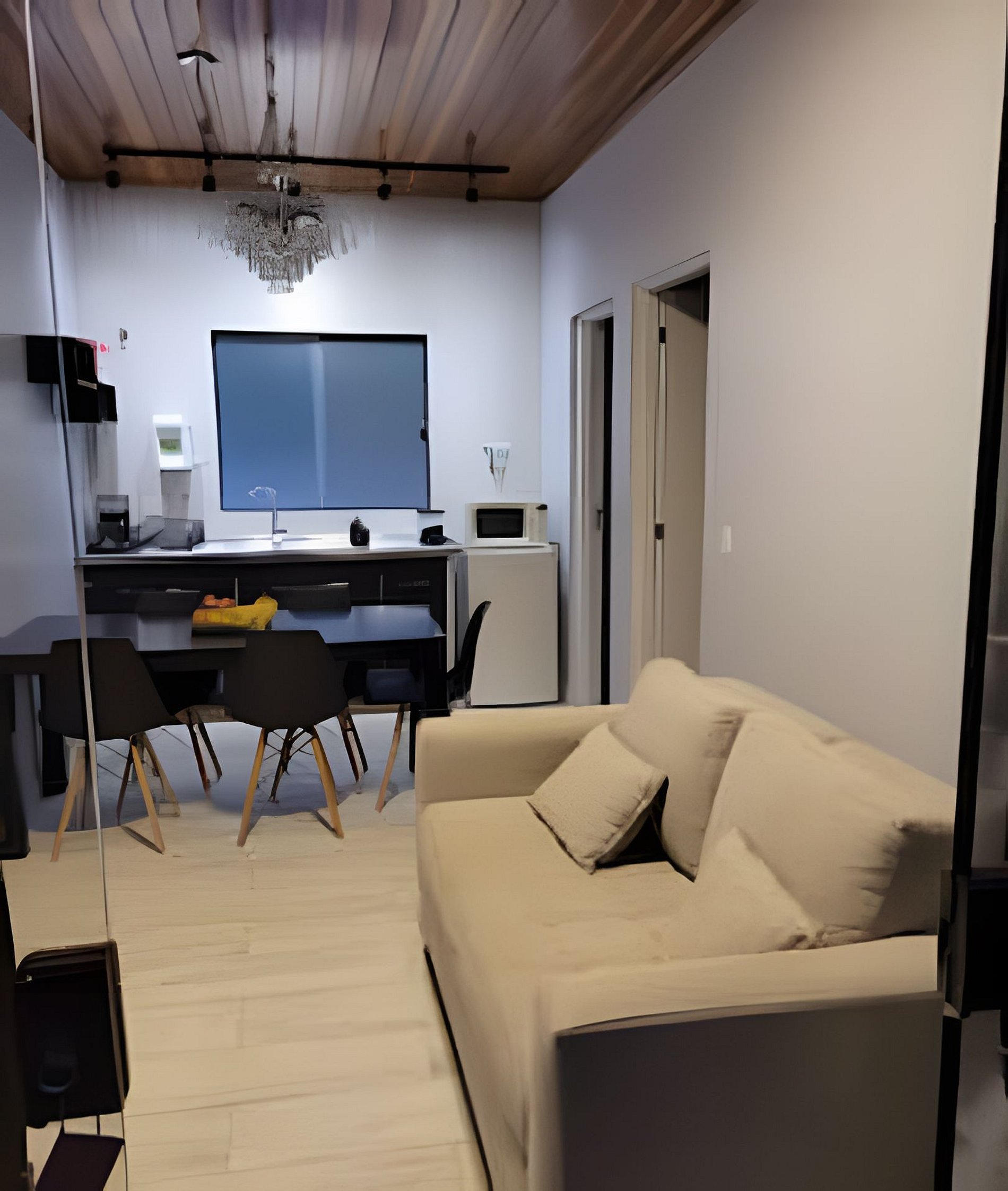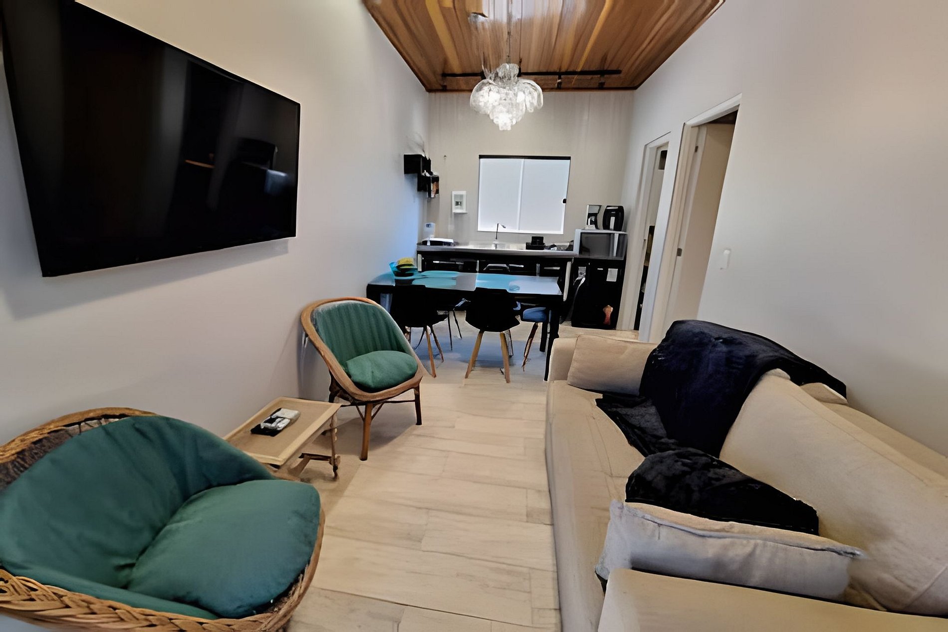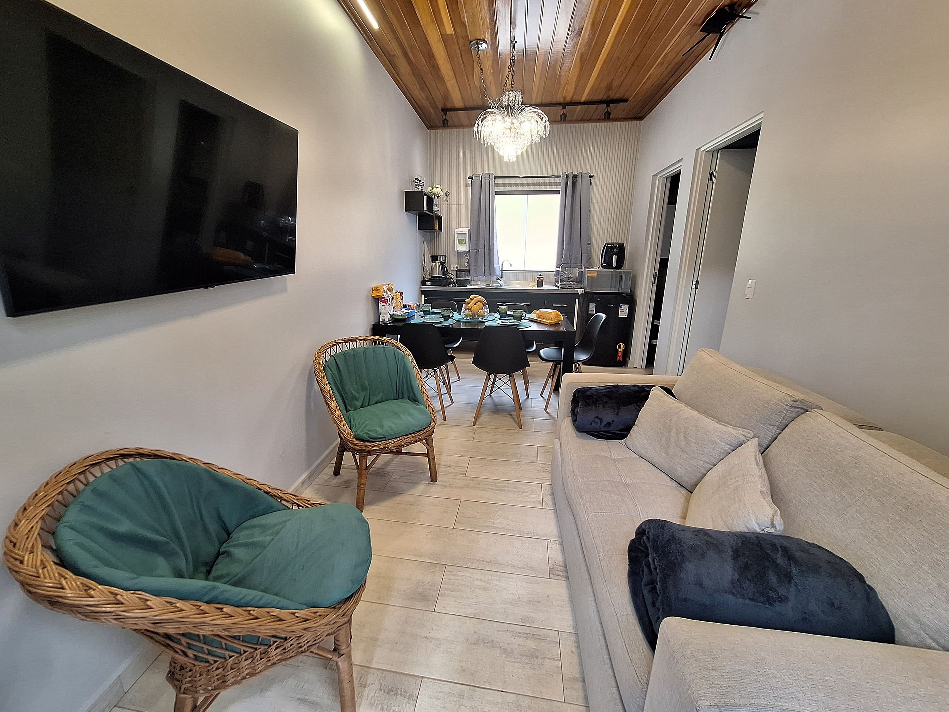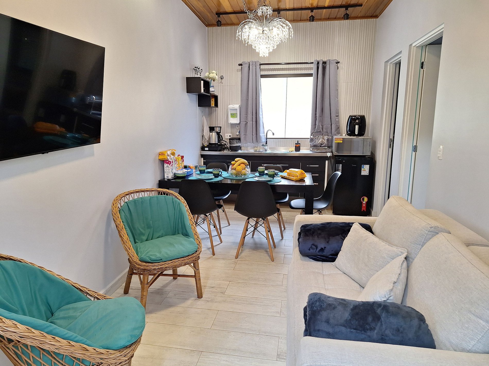O chalé possui sala de estar e de jantar com mini cozinha, além de banheiro e quarto.