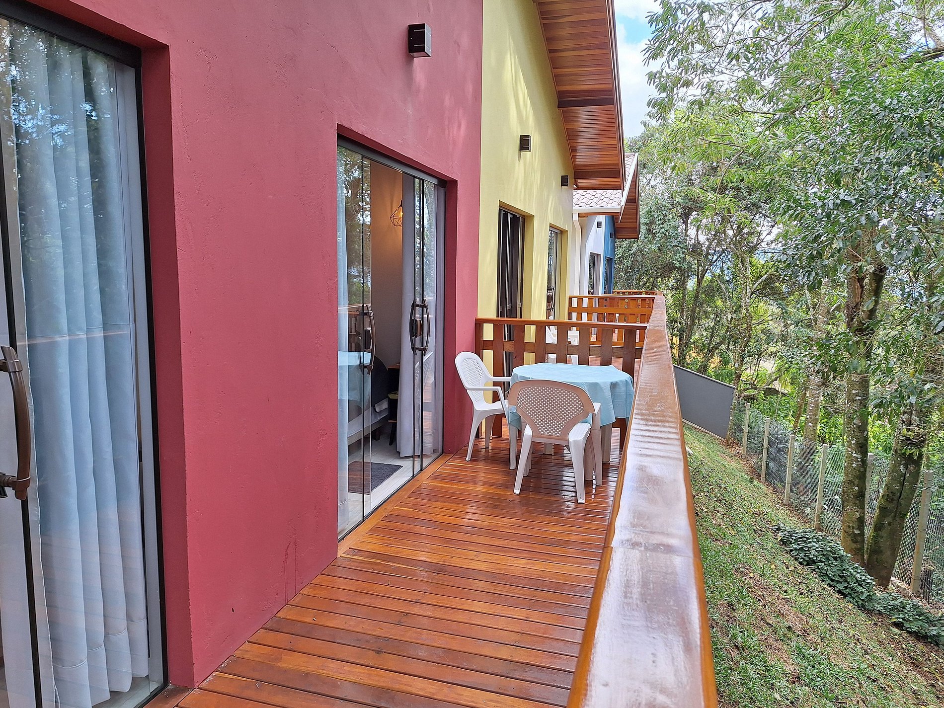 Temos uma área externa comum com outros chalés, onde podem fazer picnic e passar um tempo em família. Há cama elástica e alguns brinquedos que podem ser usados por todos os hóspedes.