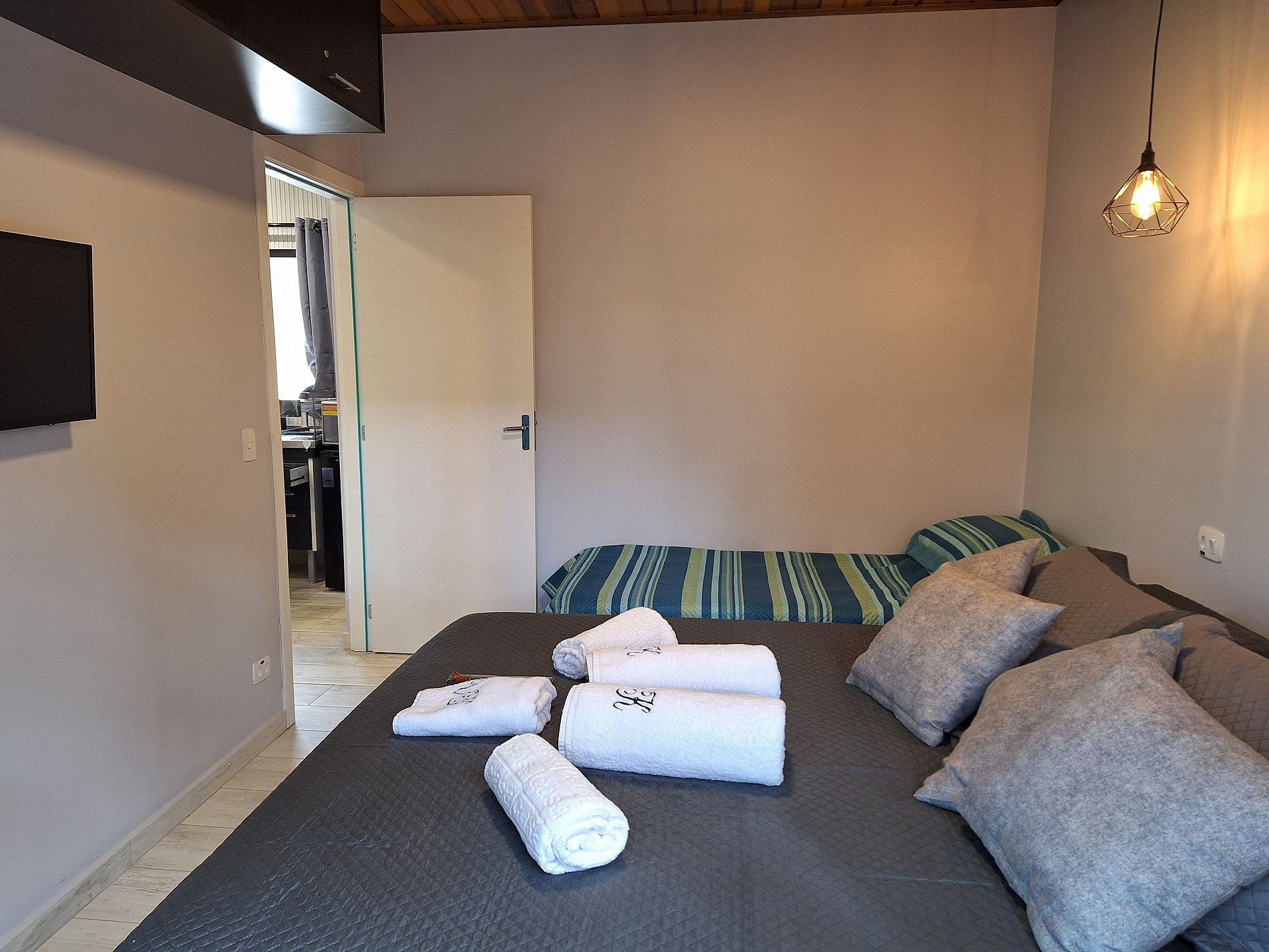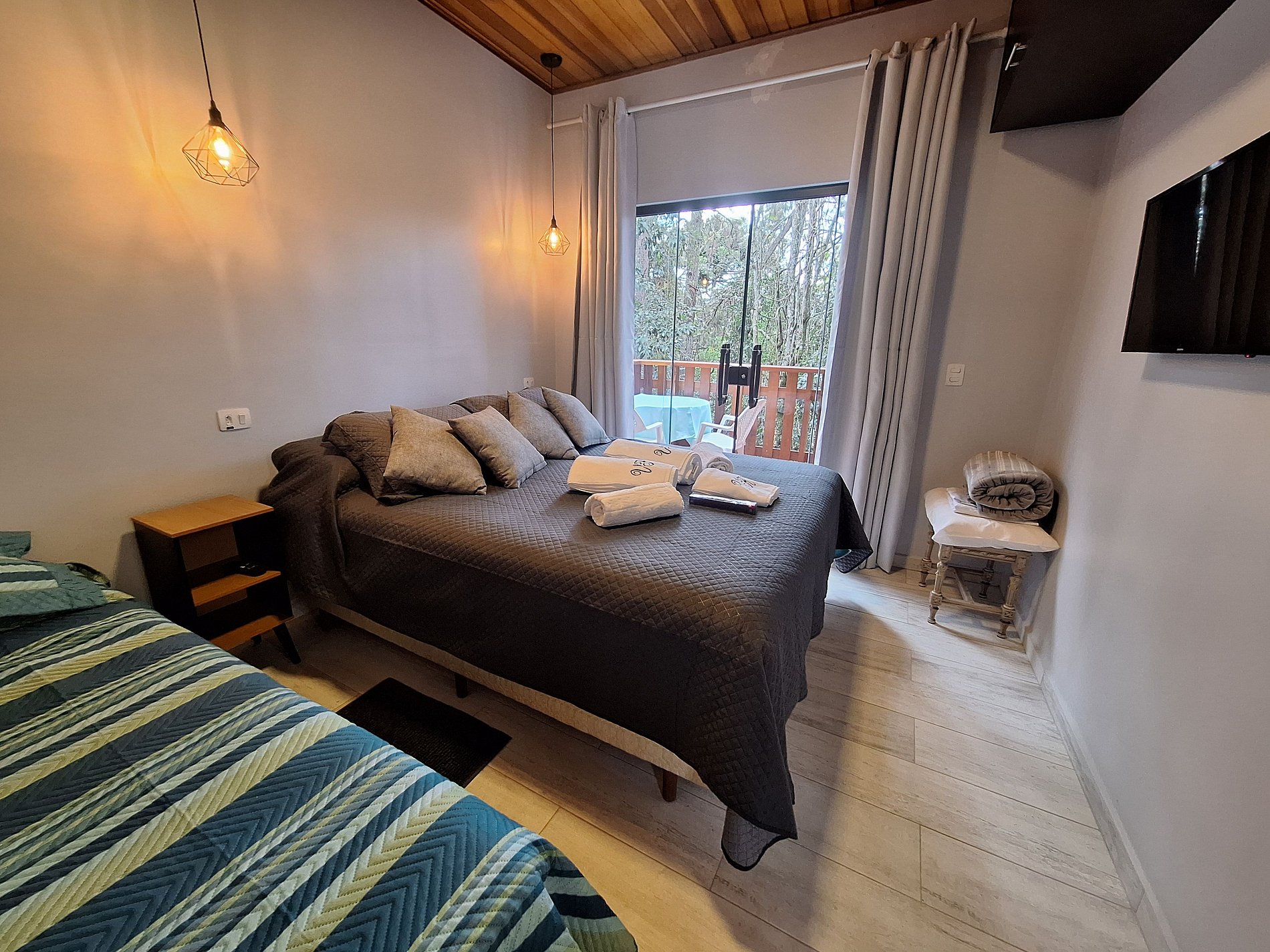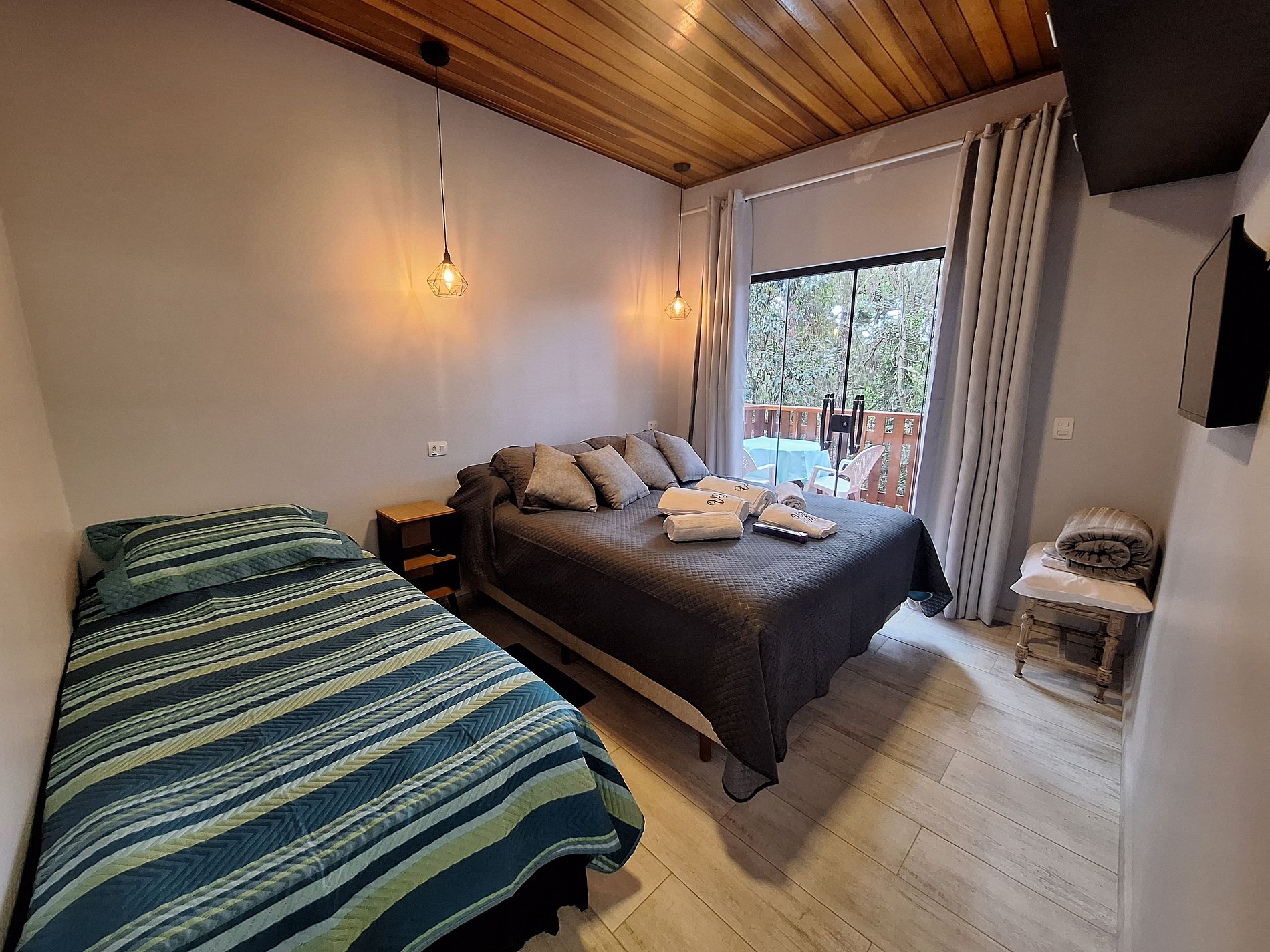 Possui uma cama de casal e um sofá cama.
